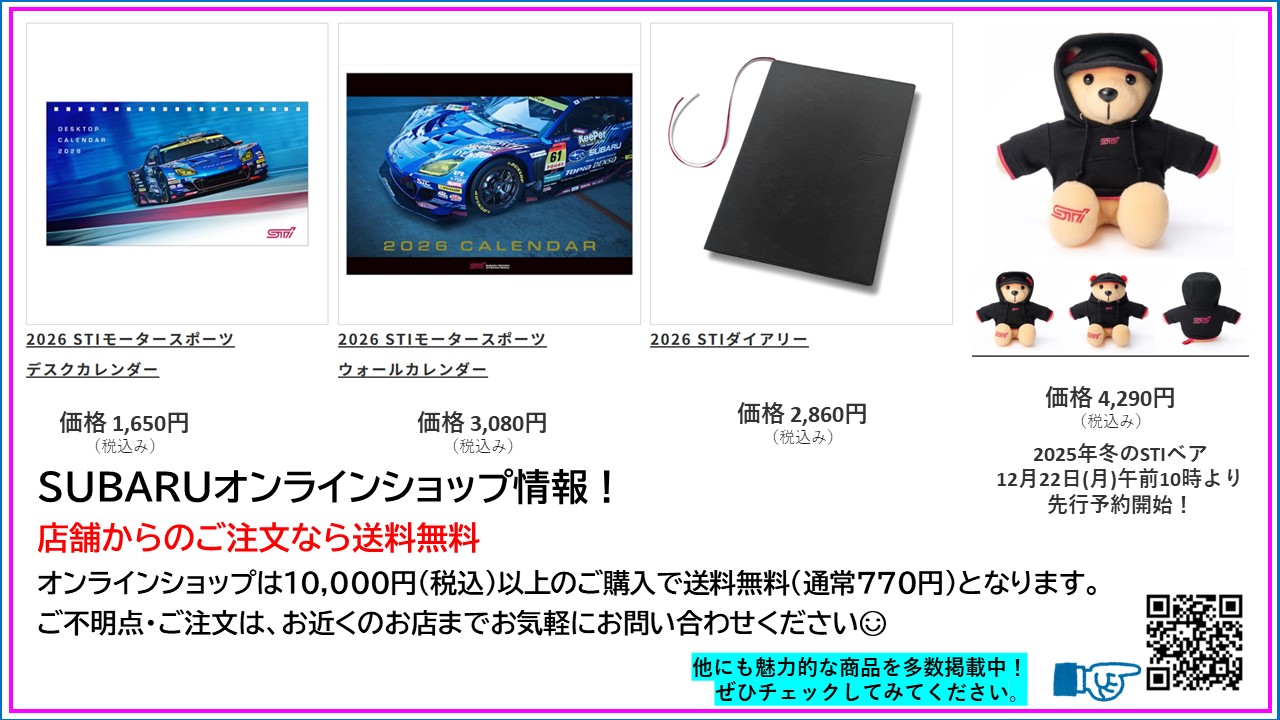 その他、バッテリーやスバルオンラインショップの商品も対象となりますので、詳しくはスタッフまでお気軽にお問合せください![]()