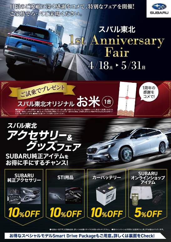 同時開催のスバル東北1st Anniversary Fairでは、車種問わずご試乗いただいた方に